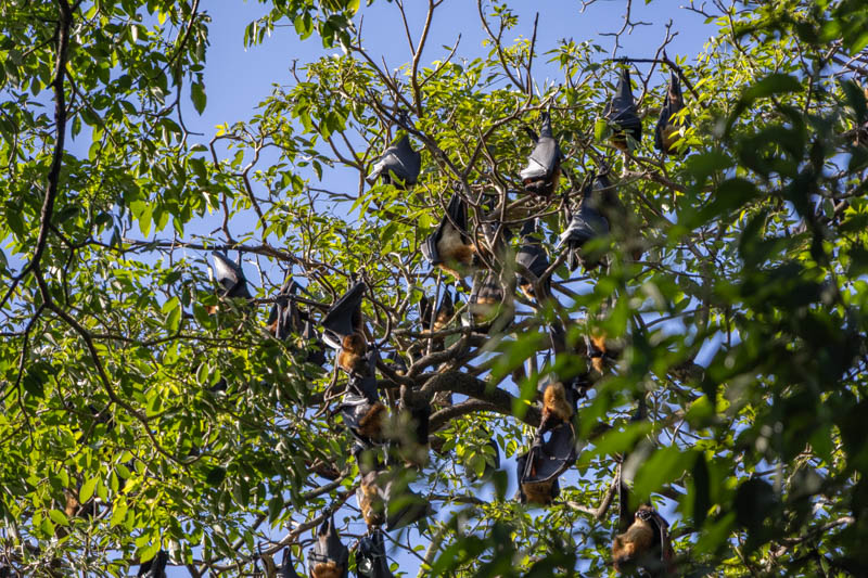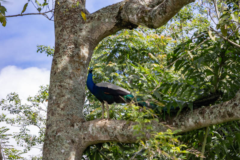 Bei den Teeplantagen haben wir einen Pfau in einem Baum gesehen: