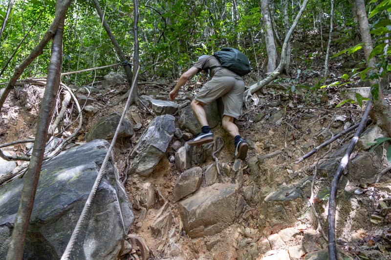 Technisch ist das alles gut machbar, auch wegen des Seils, das einem den ganzen Weg begleitet. Allerdings überwindet man fast 700 Höhenmeter auf knapp 4km Strecke. Es ist also nicht weit aber ordentlich steil. Und das bei tropischem Wetter - heftig. Gegen Ende wird man allerdings auch mit fürstlichen Aussichten belohnt: