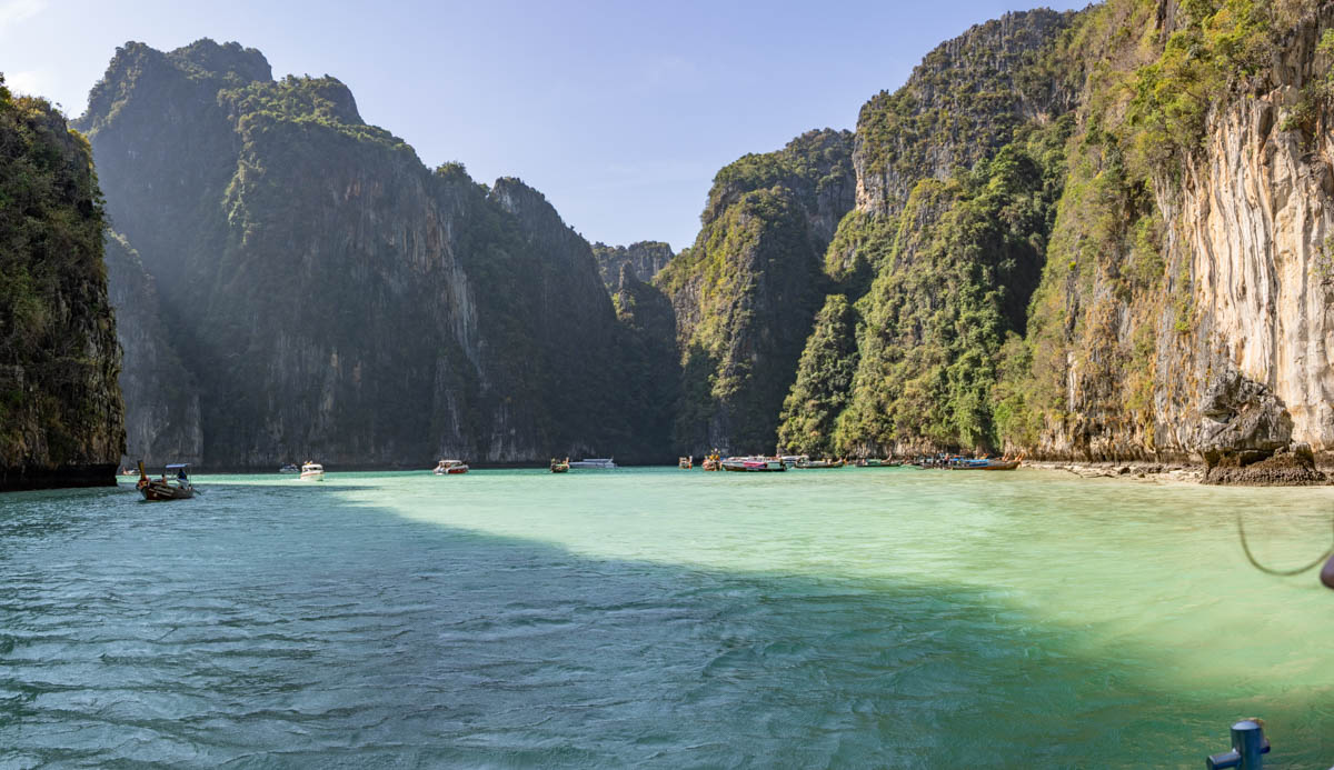 Wir hatten extra eine frühe Tour gebucht, da die Maya-Bucht wohl sehr überlaufen ist. Obwohl wir bereits um 8:00 am Anleger waren (da öffnet der Nationalpark), war schon reger Betrieb: