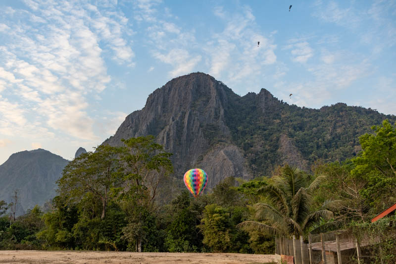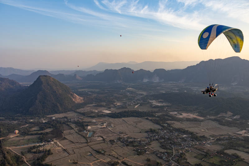 In Vang Vieng gibt es einen kleinen Flugplatz für Motorschirme, an dem wir gestern Abend schon zum kurz angehalten haben. Beim beobachten des Treibens dort hatte ich wirklich Lust bekommen das selbst mal auszuprobieren. Und da der Flug mit 1.200.000 Kip (ca. 48 EUR) für 15min erschwinglich war, habe ich die Gelegenheit genutzt. Es gab zum Glück noch eine Lücke im Flugplan für mich, sodass wir das noch spontan auf dem Heimweg einschieben konnten.