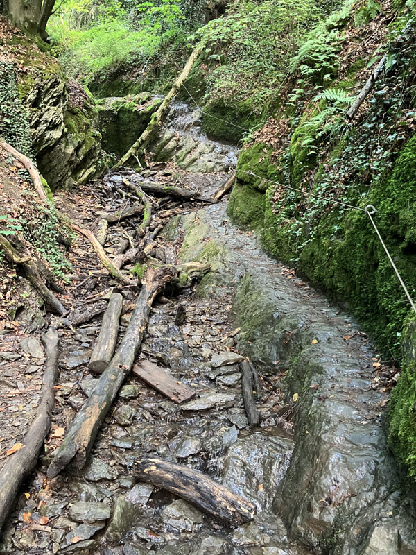 Man läuft entlang eines kleinen Baches die Klamm hinauf. Immer mal wieder auch durch das seichte Wasser: