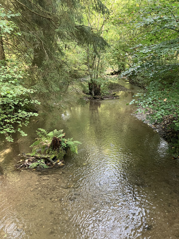 Die 15km Runde, für die ich mich entschieden hatte, startete bei einem Wanderparkplatz nördlich von Mörsdorf. Erst ging’s vorbei an zahlreichen Windkraftanlagen, und dann in eine kleine Schlucht entlang eines idyllischen Baches: