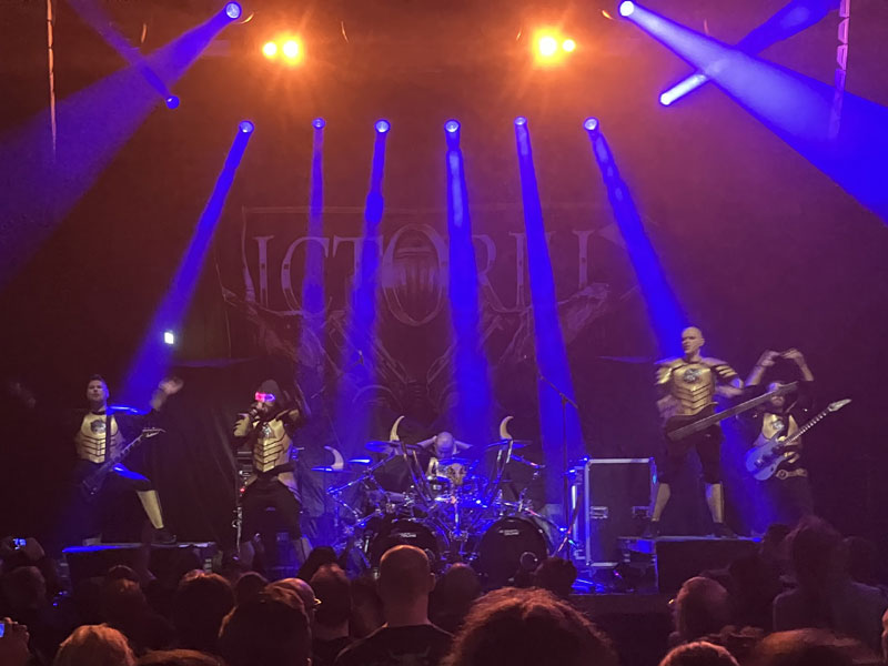 Überraschungs-Opener waren Victorius. Von denen hatte ich noch nie was gehört, war aber schon etwas neugierig als ich auf den Beckenmuttern des Schlagzeugs überdimensionale Krallen aufmontiert gesehen habe. Nach einem Powerintro á la Ensiferum kamen die Jungs dann in Ritterrüstung auf die Bühne: