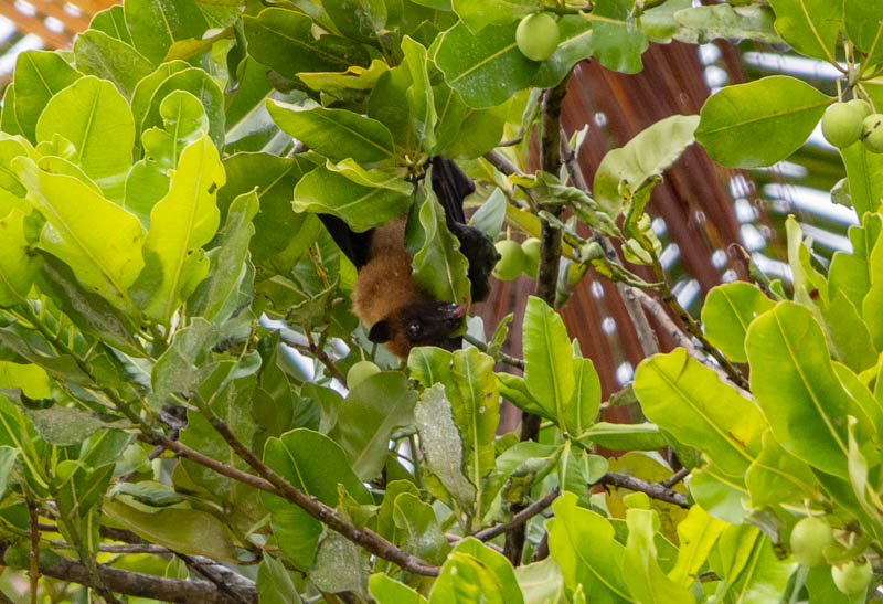 Die Flughunde sind tagaktiv und klettern auf der Such nach Nahrung durch die Bäume: