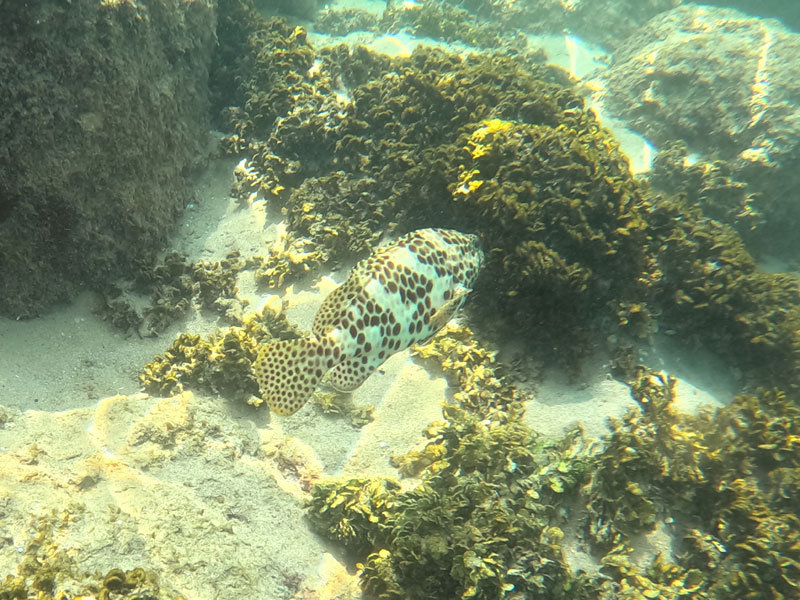 Gleich nebendran ist ein kleiner, völlig mit Seeigeln übersäter, geschützter Bereich. Ursel war so mutig und ist in dem Minenfeld tatsächlich bei Ebbe schnorcheln gegangen: