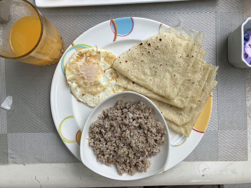 Heute ging’s von Hulhumale nach Dhigurah, einer der zahlreichen Inseln der Malediven. Aber nicht ohne ein gutes Frühstück. Es gab Kokosflocken mit Thunfisch und Fladenbrot: