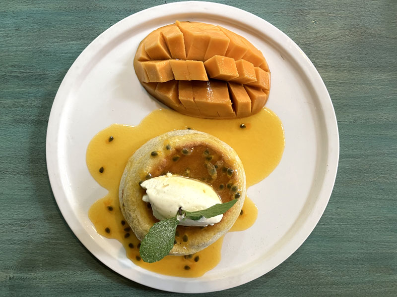 Auf dem Rückweg zur Unterkunft haben wir ein Schild mit “Mango Passionfruit Pancake Soufflé” gesehen. Da werde ich schwach: