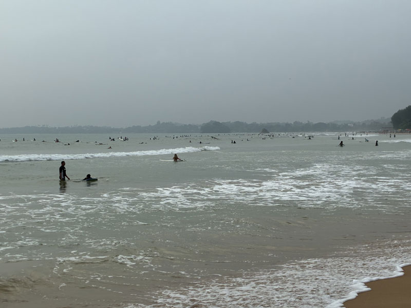 Die Surfschulen reihen sich, eine an der nächsten, fast den ganzen Strand entlang aneinander. Entsprechend ist auch das Wasser, wie in Hiriketiya, komplett voll mit Surfanfängern: