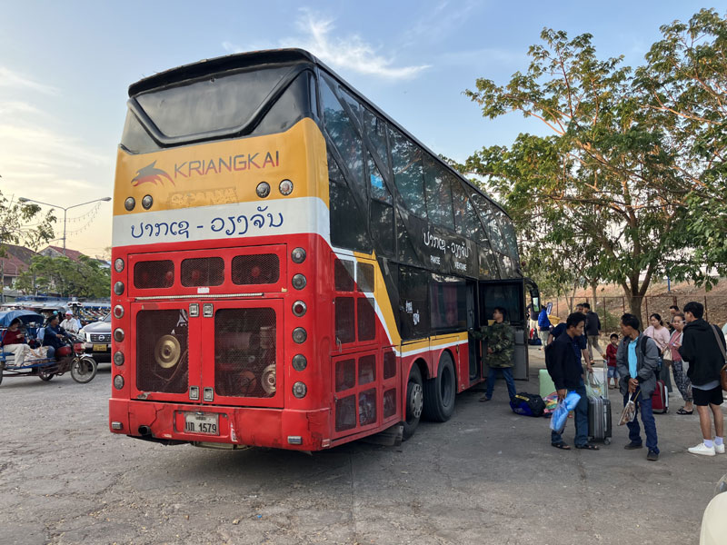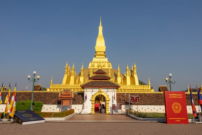 Das nächste Ziel auf unserer Router war Pakse, ca. 800km südlich von Vang Vieng. Für diese Strecke hatten wir einen Nachtbus eingeplant. Warum ich bei “Nachtbus” leicht nervöse Zuckungen bekomme, kann man hier nachlesen. Aber erstmal der Reihe nach. Erstmal ging es von Vang Vieng mit dem Minibus nach Vientiane, wo wir ca. sechs Stunden Aufenthalt hatten. Genug Zeit, um noch einen Tempel anzuschauen. Wir haben uns für den “Pha That Luang” entschieden: