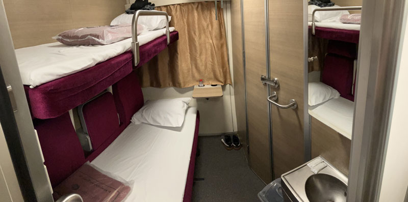 Gestern Abend sind wir mit dem Special Express No. 25 losgefahren. Er fährt von Bangkok bis nach Nong Khai, direkt an der Grenze zu Laos. Im Gegensatz zum Nachtzug der von Bangkok nach Vientiane durchfährt, kann man hier Schlafkabinen der ersten Klasse buchen. Wären wir früher dran gewesen hätten wir eine abschließbare private Zweierkabine buchen können. So waren aber nur noch genau zwei Plätze, leider in unterschiedlichen Kabinen, frei. Und so sehen die Schlafwägen aus: