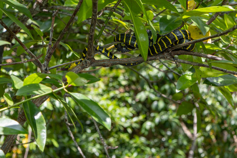 Bei unserer Mangroven-Tour mit “Lady-Mangrove” wurden wir durch den Mangroven Wald gepaddelt während sie uns allerhand über die Mangroven und das damit verbundene Ökosystem erzählt hat. Unter anderem haben wir dabei diese Schlange gesehen (giftig):