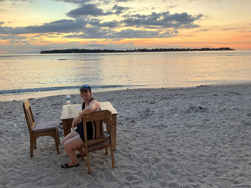 Dort haben wir, nach ein bisschen herumfragen, einen fairen Deal für die Überfahrt nach Gili Air gefunden. Schön dass im Wartebereich der MKP-Lounge guter Melodic Metalcore lief. Die fast vierstündige Überfahrt von Bali nach Gili Air kam uns relativ lang vor - wahrscheinlich waren wir einfach schon zu durch. Immerhin haben wir dann auf Gili Air tatsächlich noch eine Inselumrundung geschafft. Und unterwegs gab’s noch schön Abendessen am Strand: