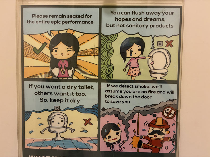 Heute ging’s dann mit dem Flugzeug nach Medan (Indonesien). Bei unserem Zwischenaufenthalt in Kuala Lumpur hat Ursel diese witzige Infotafel auf der Damentoilette entdeckt:
