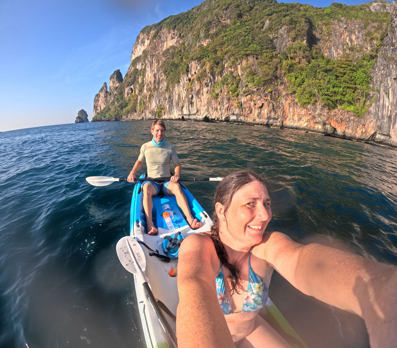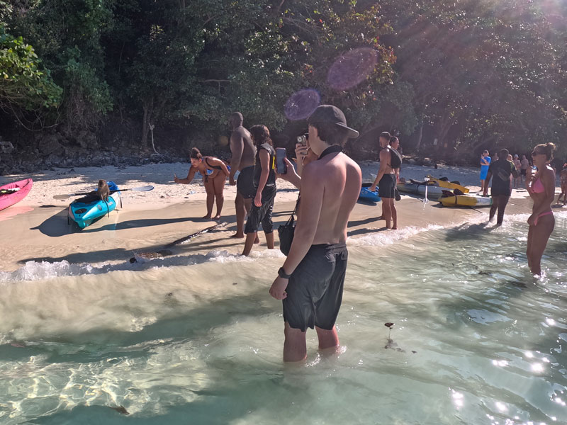 Es wäre ja aber auch zuviel verlangt sich nach einer Massage einfach ein Ründchen auf’s Ohr zu hauen. Von daher haben wir Kajaks gemietet und sind damit zum Monkey Beach (ein anderer als gestern) gepaddelt. Bei Thailand und Affen klingeln bei mir die Alarmglocken - und so war’s dann auch: Affen, die komplett hohl drehen, weil sie vermutlich von irgendwelchen Leuten gefüttert wurden und ihnen keiner Grenzen aufzeigt. Sie gingen an die Taschen der Leute und haben Sachen geklaut. Auch vor Körperkontakt haben sie nicht zurückgeschreckt. Au weia! Das einzige was den Leuten dazu einfiel war entweder schreiend vor den Affen wegzurennen oder sie zu fotografieren:
