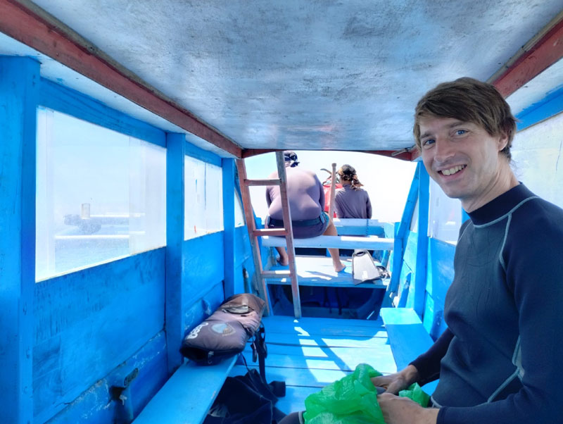 Da es mich schon seit langem interessiert hat und sich hier die Möglichkeit ergeben hat, habe ich in Kuta einen dreitägigen Anfänger-Kurs im Apnoetauchen gebucht. Hauptfokus war das Erlernen der Grundlagen in Theorie und Praxis. Wir haben heute bereits Praxisübungen in “Free Immersion” im Meer gemacht. Dabei taucht man an einer Leine bis zu einem bestimmten Punkt nach unten und anschließend wieder hoch: