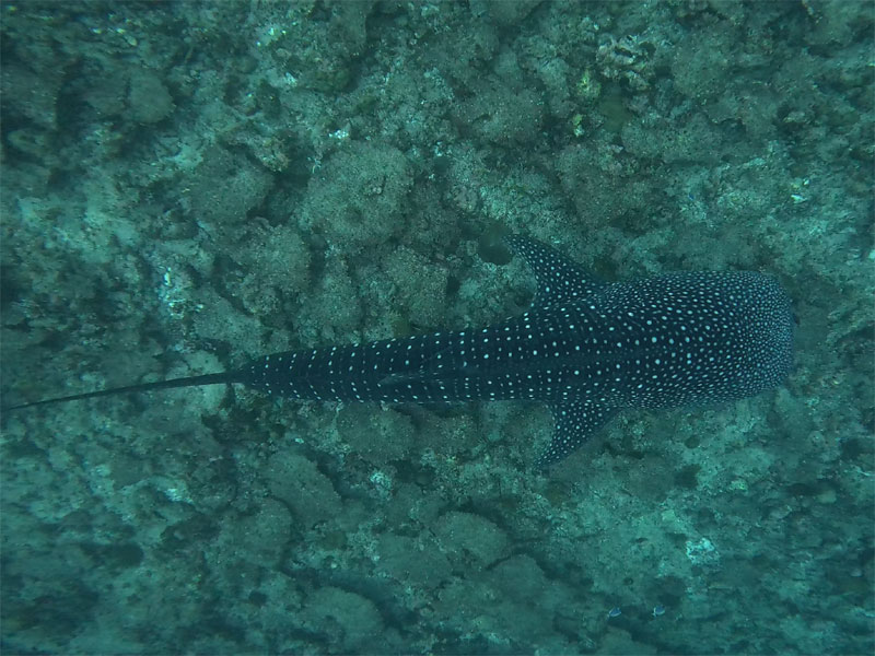 Nach einer kleinen Schattenpause, um die Mittagssonne auszusitzen, sind wir dann nochmal zum Strand. Ursel ist ja verrückt auf Wasser und wenn sie einmal in Fahrt ist, ist sie auch nur schwer wieder zu bremsen. Also ist sie noch ein paar weitere Runden schnorcheln gegangen. Und es hat sich sehr gelohnt. Sie hat einen Schwarzspitzen-Riffhai gesehen: