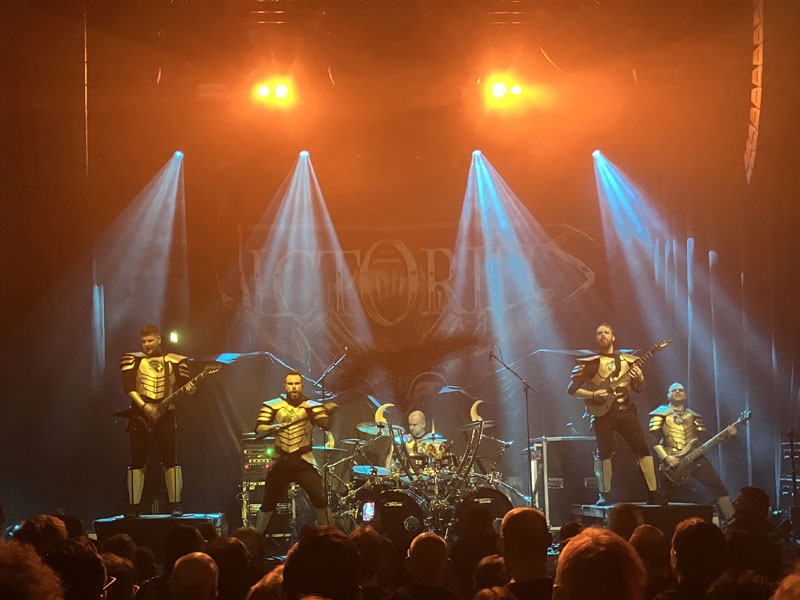 Überraschungs-Opener waren Victorius. Von denen hatte ich noch nie was gehört, war aber schon etwas neugierig als ich auf den Beckenmuttern des Schlagzeugs überdimensionale Krallen aufmontiert gesehen habe. Nach einem Powerintro á la Ensiferum kamen die Jungs dann in Ritterrüstung auf die Bühne: