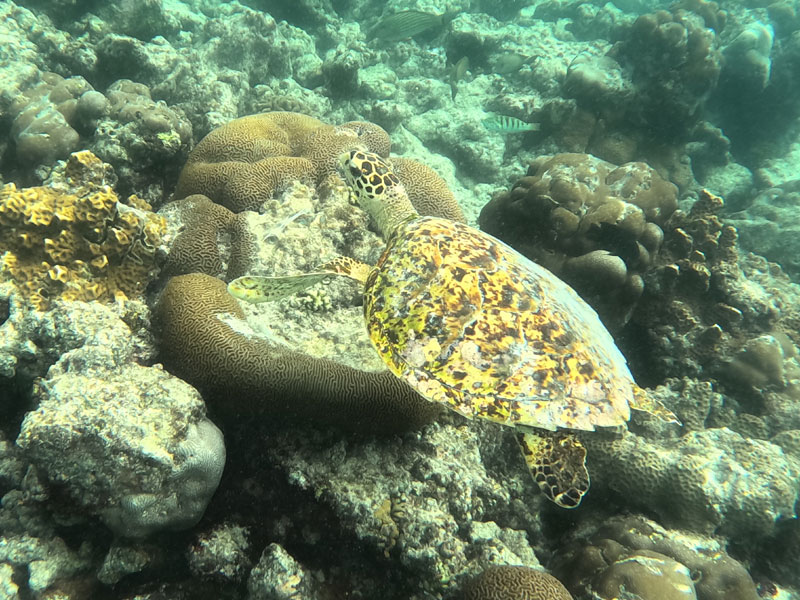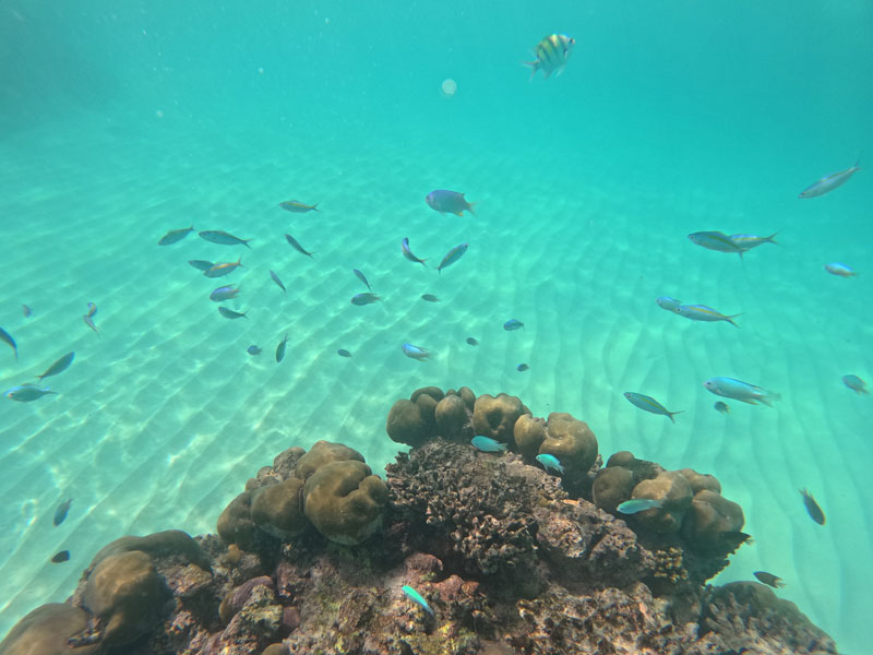 Nach der etwas hektischen Schnorchelei im Rahmen der Bootstour gestern, haben wir uns dazu entschieden heute einfach vom Strand aus loszuschnorcheln. Da konnten wir unser eigenes Tempo fahren und Fische gab es auch viele zu sehen: