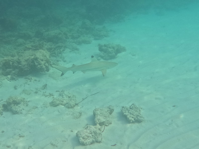 Nach einer kleinen Schattenpause, um die Mittagssonne auszusitzen, sind wir dann nochmal zum Strand. Ursel ist ja verrückt auf Wasser und wenn sie einmal in Fahrt ist, ist sie auch nur schwer wieder zu bremsen. Also ist sie noch ein paar weitere Runden schnorcheln gegangen. Und es hat sich sehr gelohnt. Sie hat einen Schwarzspitzen-Riffhai gesehen: