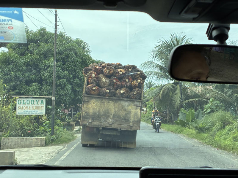 Gestern sind wir von Medan nach Bukit Lawang gefahren. Schon aus dem Flugzeug hat man in Malaysia riesige Palmölplantagen gesehen. Bei der Anfahrt nach Bukit Lawang (Indonesien) war das nicht anders. Hier werden die Ölfrüchte gerade abtransportiert: