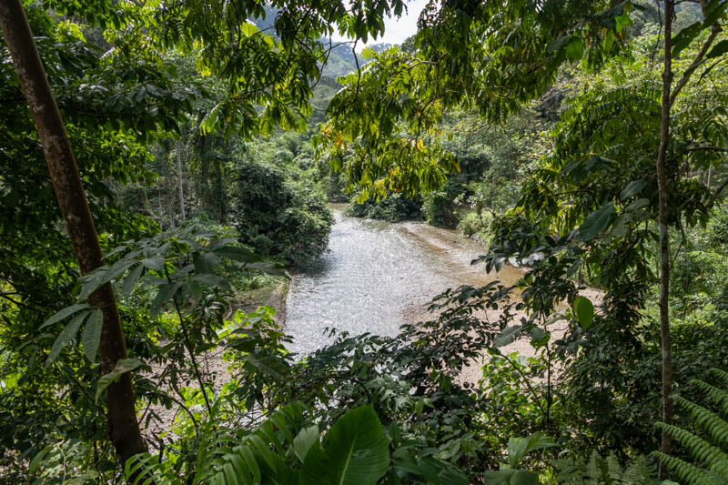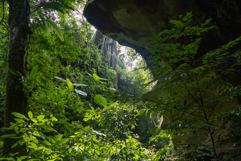 Es gibt hier keinen Wanderweg, es geht einfach mitten durch’s Gebüsch. Über Wurzeln, unter Lianen und zwischen Felsen hindurch. Stellenweise muss ich an den Laserparcours des Spionagemuseums in Berlin denken. Nach einer Weile, und ein paar noch rechtzeitig entfernten Blutegeln, kommen wir ziemlich durchgeschwitzt an einer Höhle an: