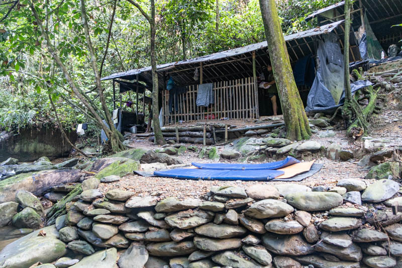 Wir waten durch den Fluss stromaufwärts. Das kalte Wasser an den Beinen und der Schatten der Bäume tut unglaublich gut in dieser schwülen Hitze. Nach ca. einer Stunde, wir kommen immer wieder an leeren Camps vorbei, erreichen wir unser Nachtlager: