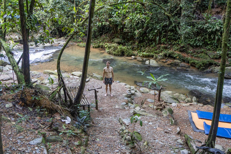 Dort wartet auch schon unser gut gelaunter, ständig singender, Koch mit einem Tempe-Snack auf uns. Viel besser ist jedoch dass wir endlich aus den verschwitzten Klamotten heraus und uns im kühlen Fluss frisch machen können: