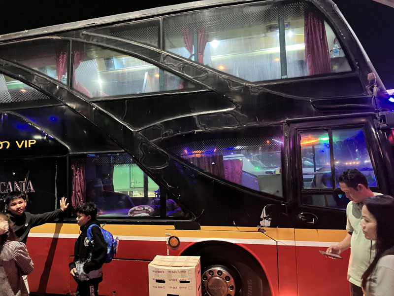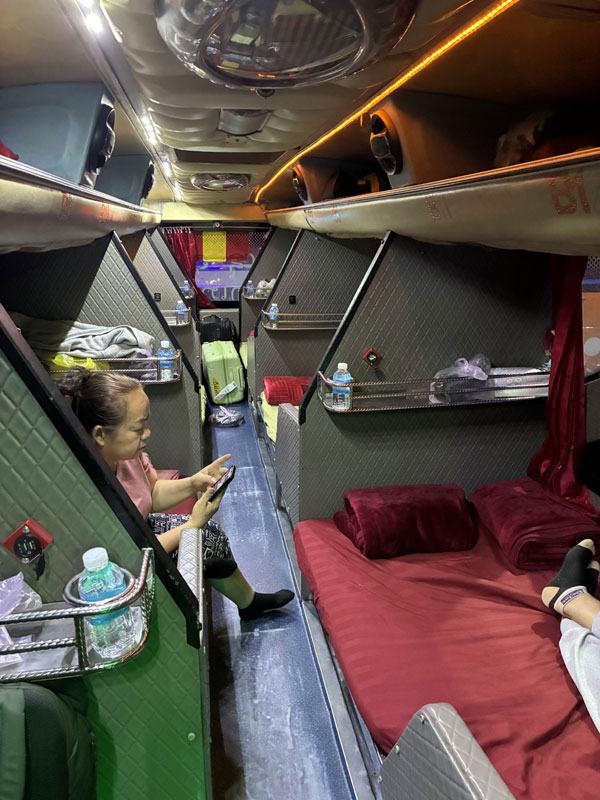 Die Schlafplätze sind immer sehr enge Zweier-Nischen. Unsere Reise-Agentur hatte uns glücklicherweise eine Nische für uns beide organisiert. Ein Touri-Mädel, das auch noch mitgefahren ist, hatte weniger Glück: sie hat sich ihren Schlafplatz mit fünf(!) anderen Leuten und einem Baby in der letzten Reihe geteilt (da wo im Schulbus früher die “Coolen” saßen). Wie sie uns später erzählt hat, ein absoluter Albtraum. Das Paar mit dem Baby hatte sie in ihre Mitte genommen (hä?), sie hatte kein bisschen Platz, die Frau ist quasi auf ihr drauf gelegen und einmal wurde sogar das Baby auf ihr gewickelt. Sie meinte, ihr war absolut zum heulen zumute. Na, da können wir uns ja richtig glücklich schätzen…