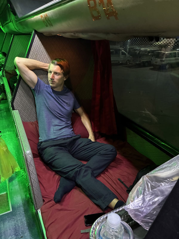Offenbar nicht mehr der neuste, aber er schien noch zu fahren. Der Unterschied zu den Nachtbussen in Lateinamerika ist allerdings dass es hier richtige Schlafliegen gibt:
