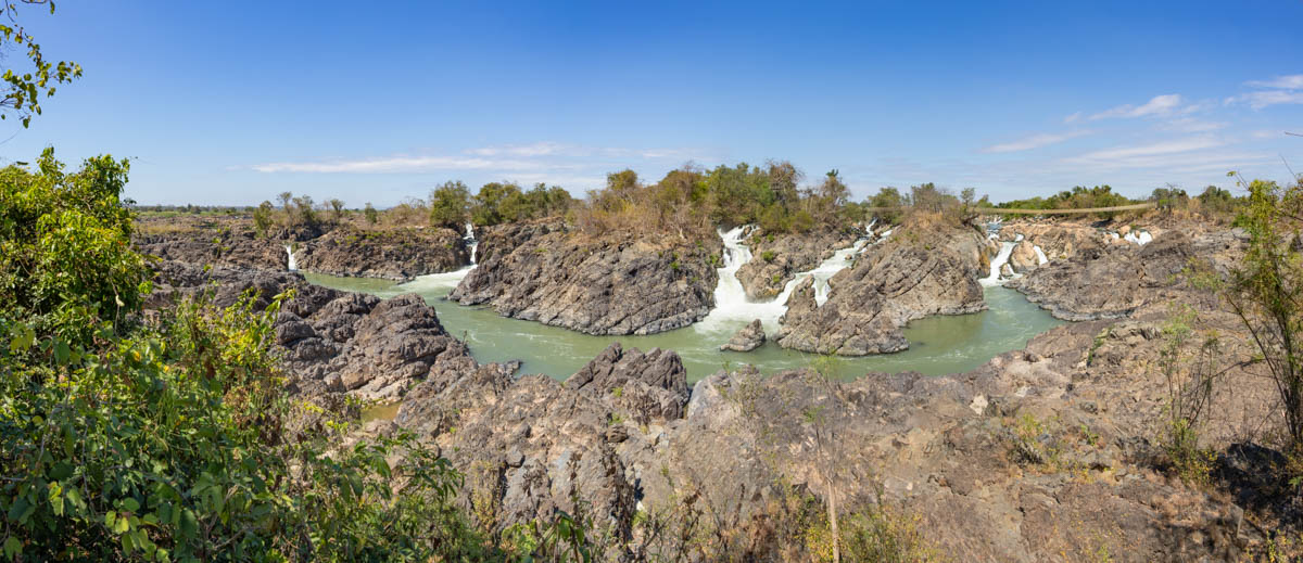 Über eine Verbindungsbrücke, damals noch von den Franzosen gebaut, gelangt man auf die südliche Nachbarinsel Don Khon. Dort kann man die Khon Phapheng Wasserfälle besichtigen, die sich über eine ziemlich lange Breite erstecken: