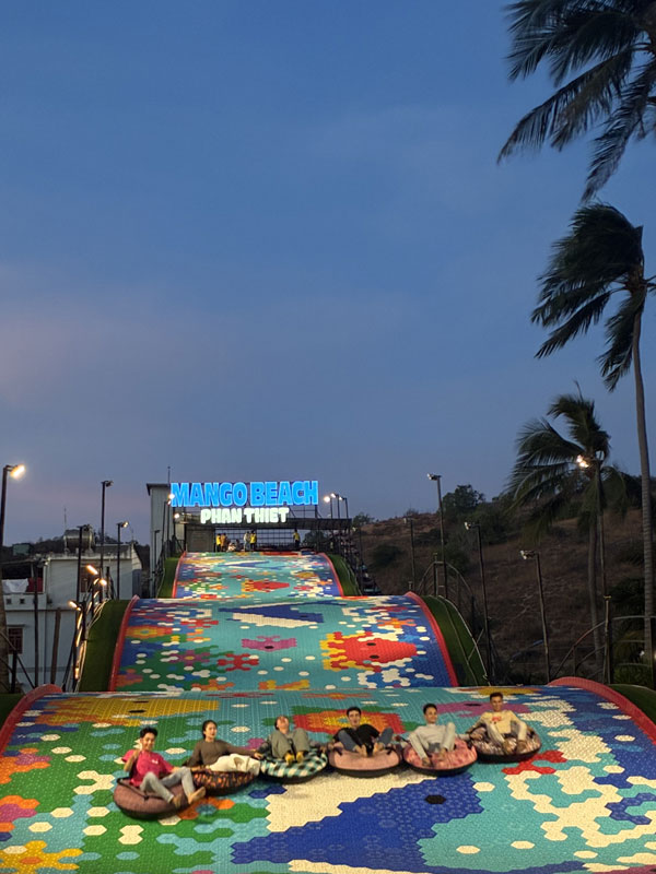 Nach einem gemütlichen “Linner” (Lunch & Dinner) sind wir zurück zur Unterkunft. Mui Ne hat einen sehr langen Resort-Strand. Die ganzen Resorts neben unserem Hotel heissen alle irgendwas mit “Beach”: Mango Beach, Luna Beach und - direkt neben uns - Hanna Beach. Sie haben kleine Spassparks, Streichelzoos und Abends Livemusik: