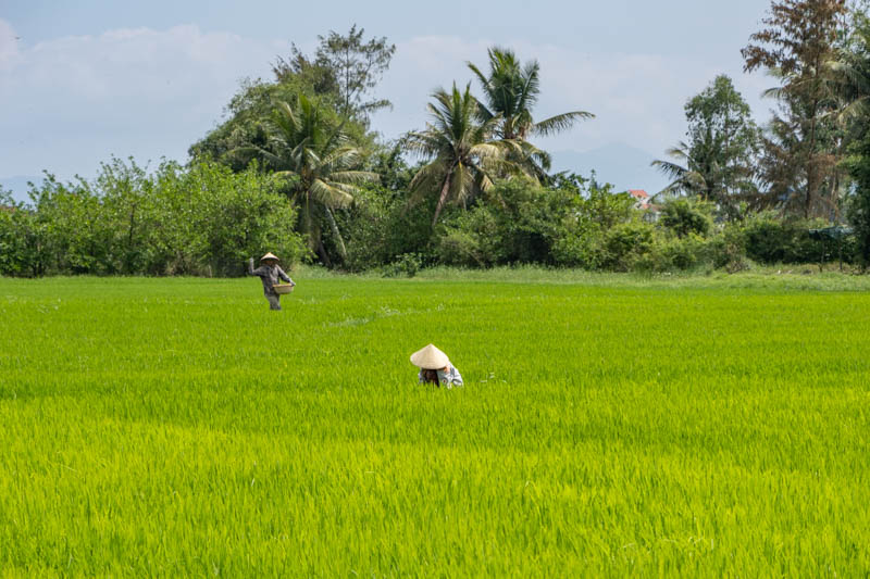 Auf dem Weg nach Hoi An fährt man durch die Reisfelder. Da sind wir doch heute mal links abgebogen, als wir die Arbeiter in den Feldern gesehen haben: