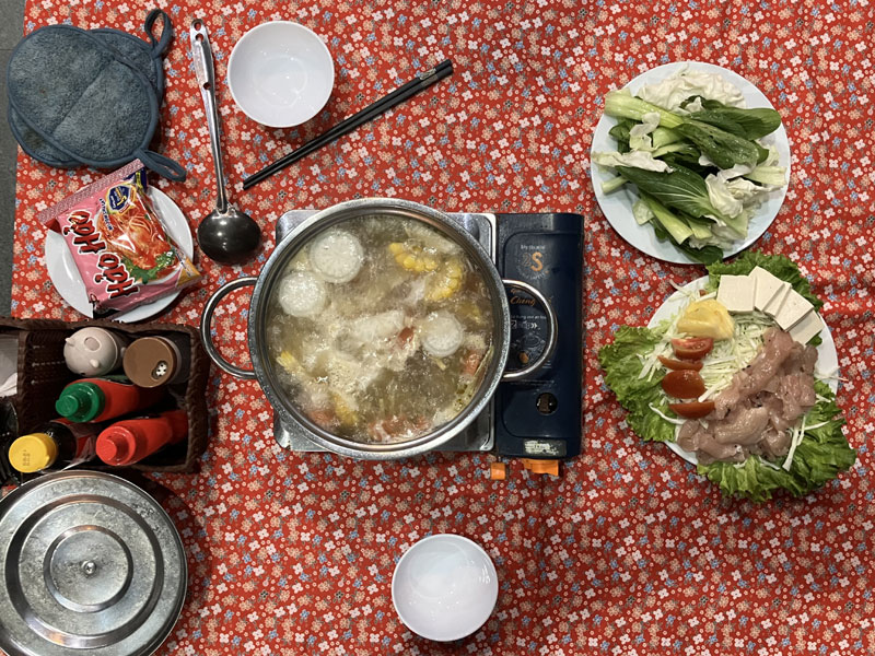 Am Abend gab’s noch ein Erlebnis. Wir haben uns in unserer Unterkunft einen “Chicken Hotpot” gegönnt. Wir hatten keine Ahnung was das ist, haben es aber herausgefunden. Wir haben einen Topf mit Brühe bekommen, zwei Teller mit Zutaten und ein Päckchen Instantnudeln. Die galt es dann in den Topf zu werfen und zu kochen (die Nudeln ganz am Schluss!):
