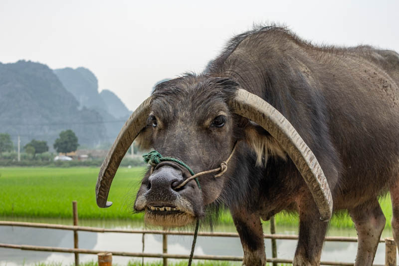 Vor einem Café stand dieser Wasserbüffel, der aussah, als wollte er uns eine geheime Botschaft zuflüstern: