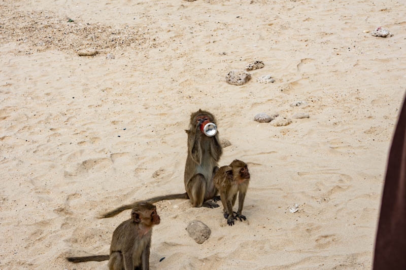 Eigentlich war noch ein Schnorchelhalt eingeplant, aber wie man auf den Bildern sehen kann war das Wetter nicht sonderlich gut. Deshalb hat schnorcheln keinen Sinn gemacht und wir sind stattdessen noch zu Monkey Island gefahren. Unser Reiseleiter hat extra betont dass man wegen der Affen nichts zu essen oder trinken auf die Insel mitnehmen soll. Einer hat nicht richtig zugehört und schon wurde seine Cola-Dose geschnappt und leergetrunken: