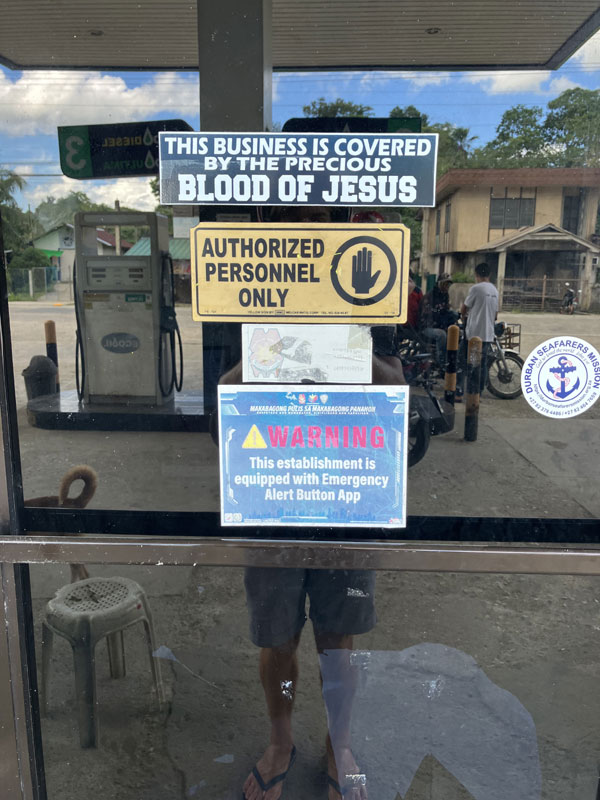 Generell stellt man hier gerne seine Frömmigkeit zur Schau. Auf Fahrzeugen prangt häufig ein Bibelspruch. An einer Tankstelle haben wir dieses Schmuckstück gesehen:
