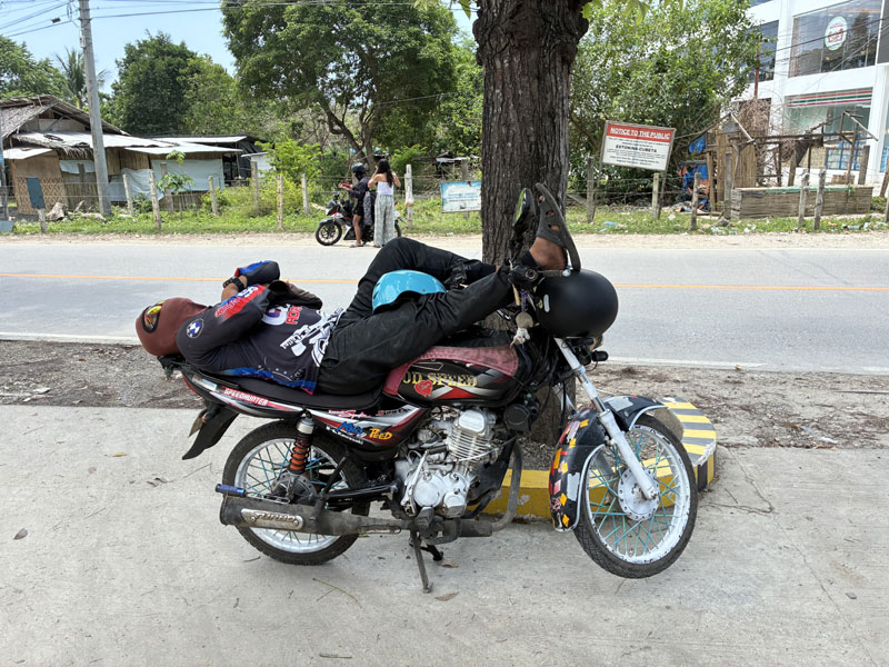 Vorgestern sind wir von Bohol mit der Fähre nach Cebu gefahren. Vor der Abfahrt konnte Ursel noch eine schöne Straßenszene einfangen. Die Leute schlafen hier, wie in den anderen Ländern die wir bisher besucht hatten, an allen möglichen Orten - auch auf ihren Mopeds: