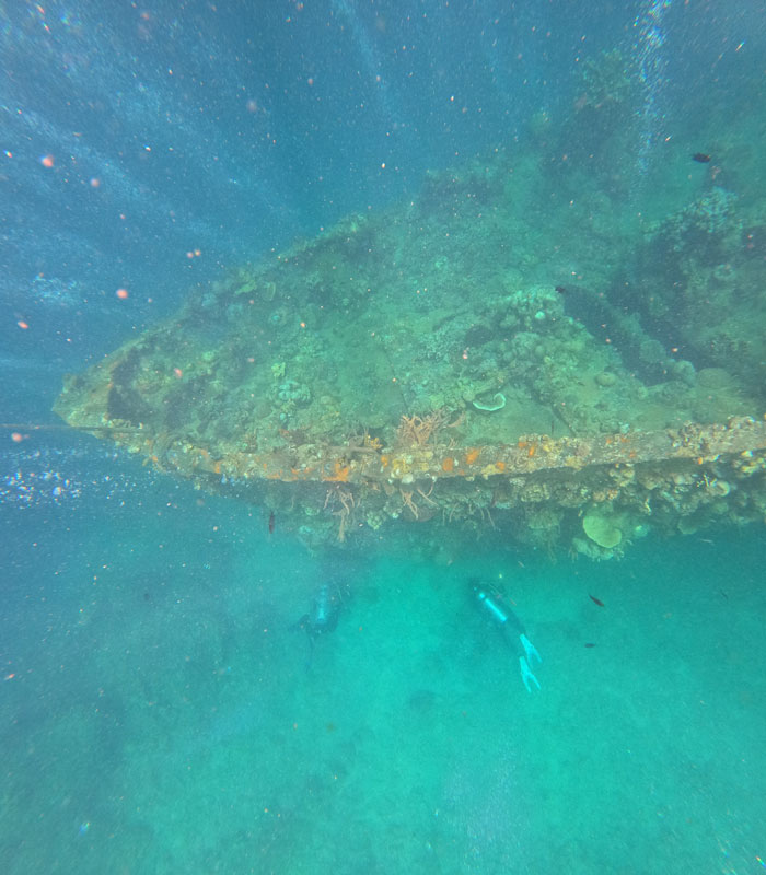 Das Schiffswrack eignet sich, aufgrund seiner geringen Tiefe, wohl gut für Tauchanfänger - daher auch die ganzen Bläschen.