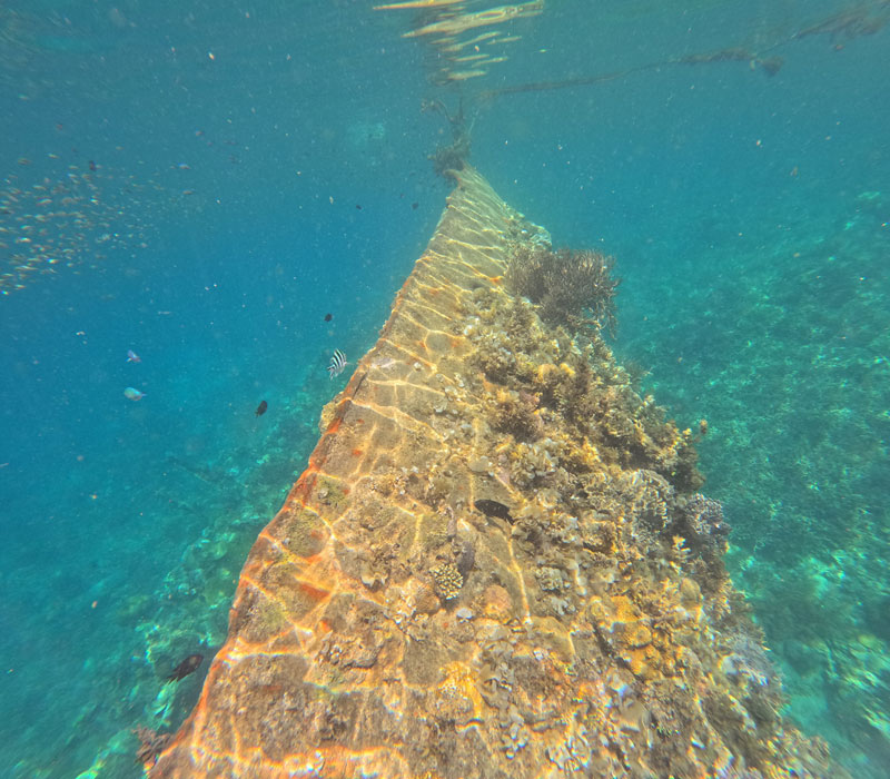 Nachdem wir ja gestern zum ersten Mal an einem Schiffswrack geschnorchelt sind, waren wir sehr gespannt auf die heutige “Reefs & Wrecks” Tour. Diesmal ging’s mit dem Boot richtung Westen. Erster Schnorchelstopp war das East Tangat Shipwreck (soweit ich das rausfinden konnte):