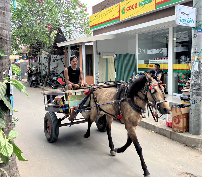 Gili Air ist, zumindest an Land, eine Verbrennermotor-freie Insel. Das ist extrem angenehm weil hier der Lärm und Gestank der Verbrenner fehlt. Stattdessen benutzen die Leute hier Fahrräder, E-Roller und Pferdefuhrwerke: