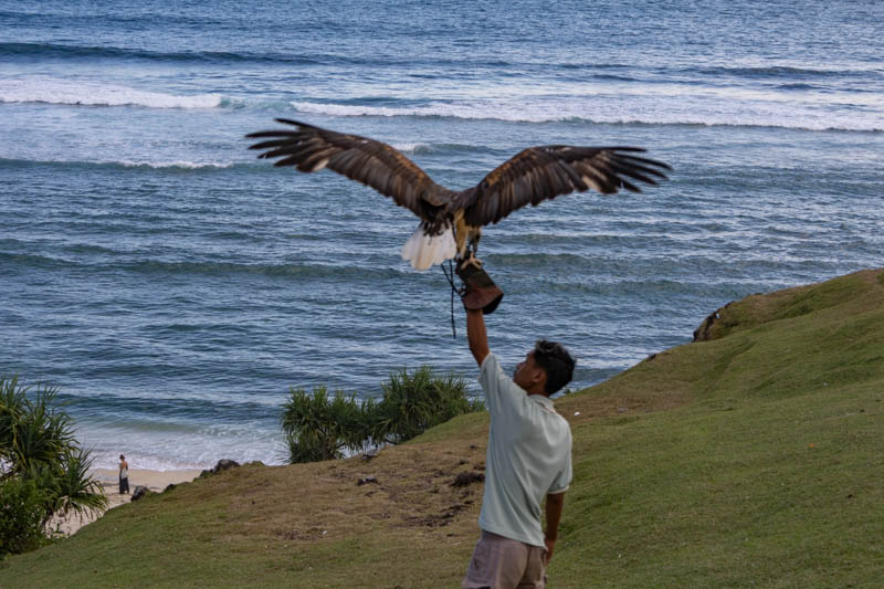 Zum Glück hatte Ursel die Idee noch den Merese Hill anzusteuern, einen Aussichtspunkt östlich von Kuta. Gesagt, getan. Die Instagram-Gemeinde versammelt sich dort bevorzugt zum Sonnenuntergang, aber auch davor war schon einiges los. Es gab zwei Leute mit Adlern oder sowas: