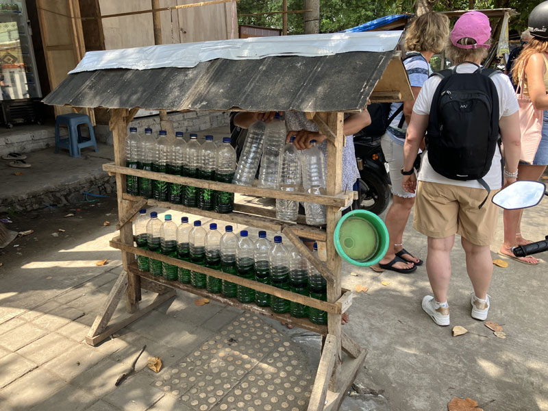 Erstmal mussten wir aber den Sprit beim Roller auffüllen, da der so gut wie leer war. In eher ländlichen Gegenden sieht man da immer wieder so Stände mit Flaschen in denen eine grüne, blaue oder rote Flüssigkeit drin ist: