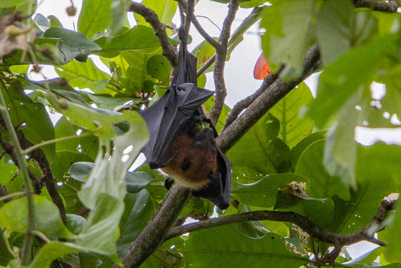 Die Flughunde sind tagaktiv und klettern auf der Such nach Nahrung durch die Bäume: