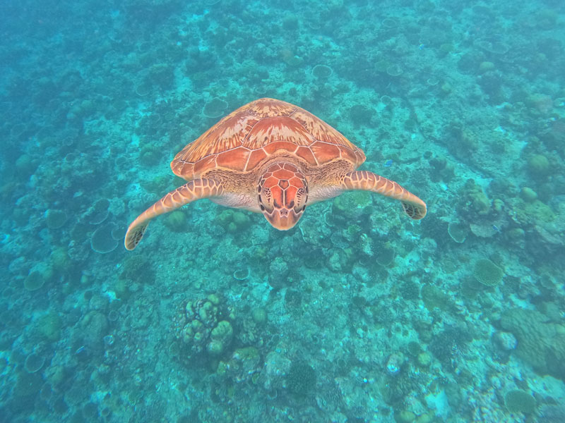 Ok, coole Sache: alle haben den Walhai also gesehen ausser ich. Naja. Dann ging’s weiter, vielleicht gibt’s ja noch eine Sichtung. Dem war aber nicht so, und so durften wir einfach noch so ein bisschen an einem Riff schnorcheln. Dort haben wir eine Schildkröte gesehen, die fast mit Ursel kollidiert wäre: